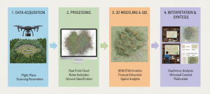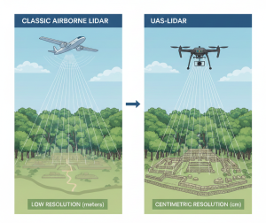 LiDAR from aircraft was historically limited by high costs and low resolution, but recent advances allow centimetric-resolution data acquired at low cost, enabling the detection of microtopography otherwise invisible beneath vegetation or modern alterations.